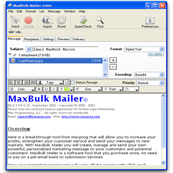 Con MaxBulk Mailer tienes la posibilidad de enviar e-mails masivamente para enviar campañas de marketing. Cada correo electrónico puede contener etiquetas personalizadas con tal de que los destinatarios reciban mensajes adaptados, admitiendo los mensajes desde textos y conjuntos HTML hasta ficheros adjuntos.